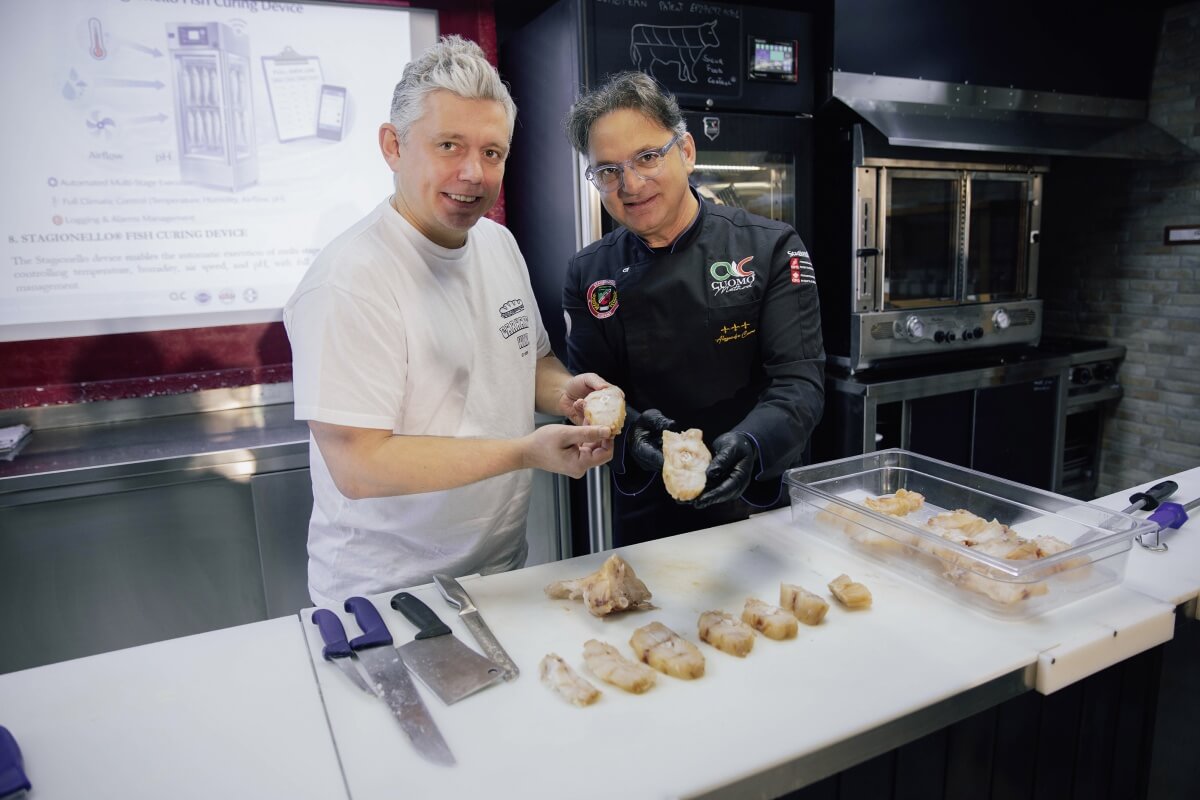 Negli ultimi anni il mondo della gastronomia ha iniziato a guardare al pesce con occhi nuovi. Tecniche tradizionalmente legate alla lavorazione della carne, come la frollatura o la maturazione controllata, stanno trovando spazio anche nella cucina di mare, aprendo possibilità di ricerca e sperimentazione che fino a poco tempo fa erano difficili da immaginare. È proprio in questo contesto che si colloca il lavoro della Stagionello Academy, un luogo di formazione e confronto dove chef, tecnici e professionisti del settore si incontrano per approfondire le tecniche di cura, maturazione, frollatura e trasformazione del pesce. Qui la teoria incontra la pratica, ma, soprattutto, la tradizione dialoga con la scienza. Tra gli ospiti dell’ultimo corso dedicato al dry curing del pesce c’era chef Alvaro Garrido, protagonista della cucina basca contemporanea e fondatore del ristorante Mina di Bilbao (www.restaurantemina.es), 1 stella Michelin.