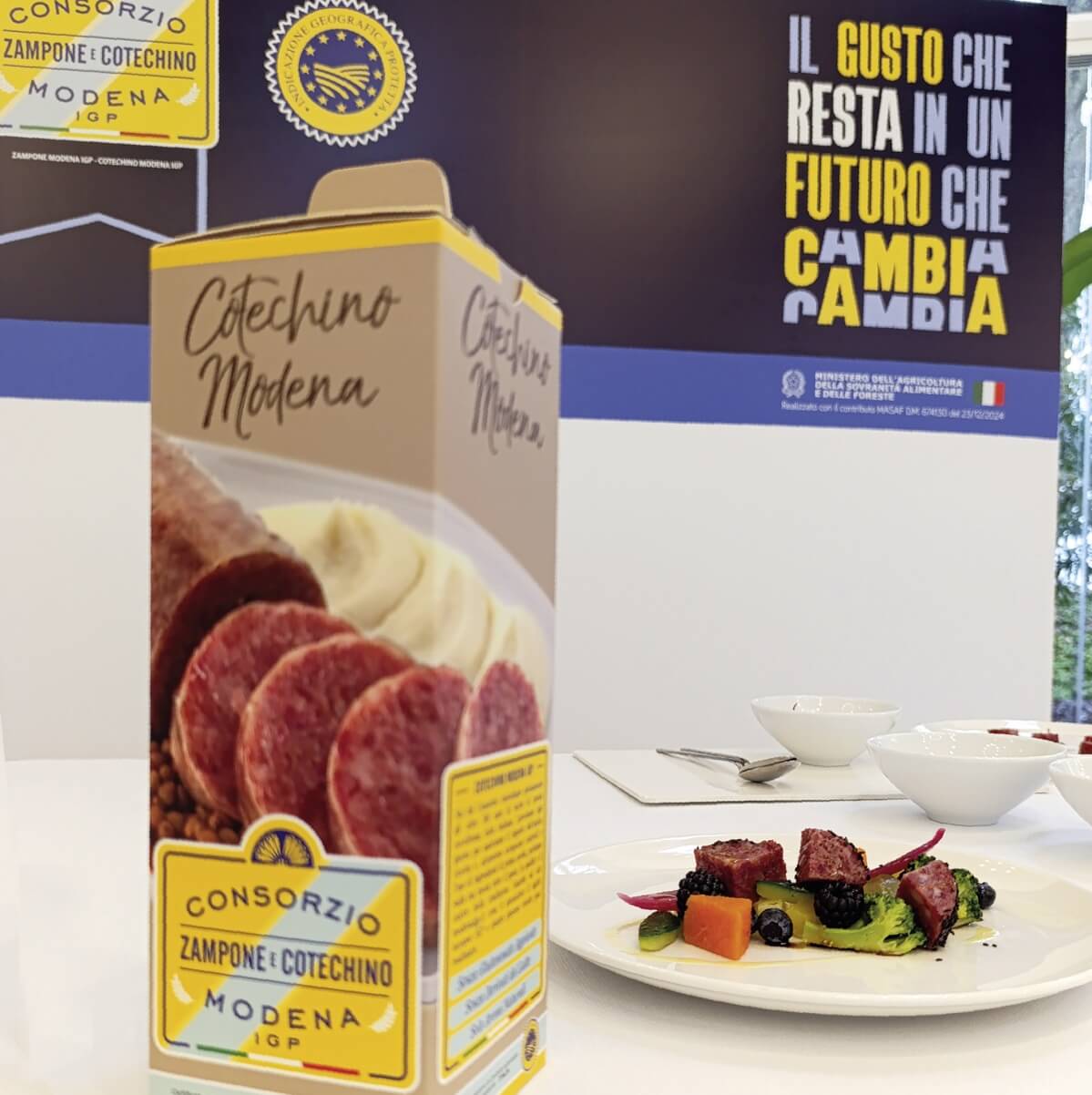 A riprova che la sfida del nuovo posizionamento del Cotechino Modena IGP sia non solo auspicabile ma fattibile, al termine della presentazione delle ricerche si è svolto uno showcooking con protagonista il Cotechino Modena IGP tenuto da due chef stellati. Si tratta di Igles Corelli, chef che ha conquistato cinque stelle Michelin nel corso della sua carriera, noto per la sua filosofia di cucina circolare, e di Luca Marchini, che con la sua stella Michelin al ristorante modenese “L’Erba del Re” unisce la tradizione emiliana con l’innovazione, creando piatti che raccontano storie di territorio e tecnica. Il primo ha proposto una “Insalata di cotechino al sesamo nero con verdure e frutta e Aceto Balsamico Tradizionale di Modena DOP”, mentre il secondo ha preparato le “Polpette di cotechino con salsa di datterini e crema di Parmigiano Reggiano 24 mesi”. Piatti che hanno dato una valida dimostrazione di come il cotechino possa essere considerato un ingrediente adatto a tantissime ricette più o meno iconiche della cucina italiana (ragù, polpette; Marchini, ad esempio, propone dal 2008 un Hamburger modenese con cotechino, salsa verde, salsa al cren e pane alle pere) perfettamente utilizzabile in ogni stagione dell’anno.