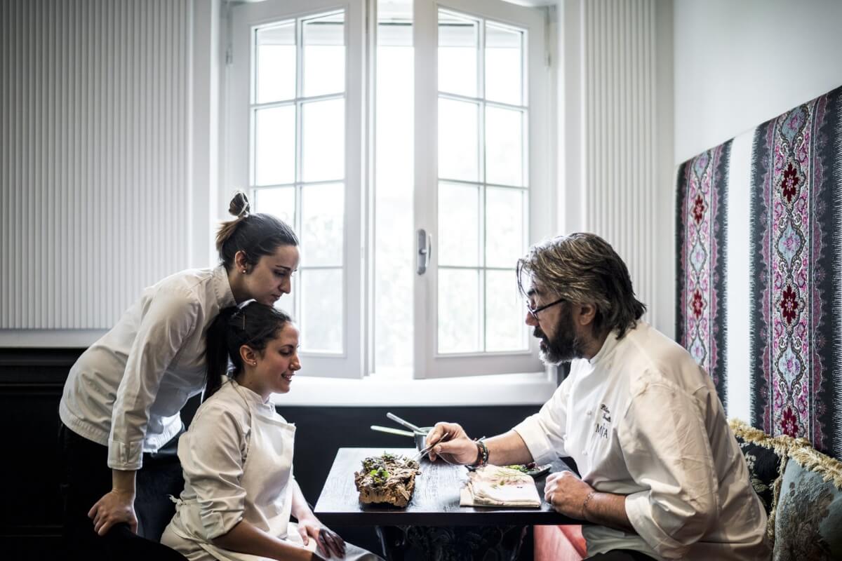 Se fosse questione di stelle, ci sarebbe da mettere in conto un intero planetario. Pochi locali in Italia garantiscono infatti una pausa di stile e di gusto come Miramonti l’Altro, uno squarcio di luce anticipato da prato elegante e verde tra villette dal sapore popolano e poco distante dal traffico che sale la Valtrompia. Miramonti l’Altro non è solo la storia di una famiglia, ma è lo specchio della società bresciana. Dinastie di imprenditori e piccoli-grandi lavoratori autonomi si concedevano nei primi anni Sessanta la cena del sabato sera o il pranzo della domenica nell’ordinato Miramonti, alto sui colli di Caino, una breve pausa prima di tornare a produrre tondini, rubinetti e armi. C’era allora una giovane e intraprendente coppia di sposi, Giuseppe e Maria Piscini, lui in sala e lei ai fornelli, che deliziava quei nuovi ricchi grazie ai risotti ai funghi, pasta con la selvaggina, salamelle alla brace e gelato alla crema. Nel 1966 la sintesi di un lavoro paziente e accurato era l’ottenimento della stella Michelin. I figli Mauro e Daniela talvolta gattonavano tra i tavoli impregnandosi di quel calore e di quella abnegazione nei confronti della ristorazione che avrebbero messo a frutto qualche anno dopo — era la fine del 1981 —, nel loro Miramonti l’Altro. Tanto da giungere alla seconda stella nel 2000.