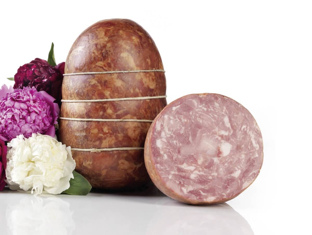 Un tempo era considerato alla pari — se non superiore — della mortadella. Fino a metà del Novecento si trovava in tutte le gastronomie bolognesi, tagliato in fette spesse, servito con panini morbidi o accompagnato da ricotte e mostarde. Oggi la sua produzione è appannaggio di pochissimi artigiani, che lo lavorano ancora con carni di suino pesante italiano, allevato senza OGM, e con minime quantità di nitriti, per garantire un prodotto pulito, genuino e profondamente territoriale. Il lyon è un nome che tradisce le origini francesi della mortadella, ma in realtà è un prodotto tutto bolognese. Noto anche come mortadella fina o salame cotto, nasce dall’abitudine, già in uso nel Settecento, di insaccare l’impasto della mortadella in budelli più piccoli, soprattutto nel budello gentile, e di cuocerlo in modo simile, ma con un risultato più compatto e intenso. È il fratello minore della mortadella, sì, ma ha un carattere tutto suo: più asciutto, più deciso, con una persistenza aromatica sorprendente. Le carni usate — spalla, gola (in piccoli cubetti), ritagli di prosciutto, trippino e magro di gola — sono miscelate in modo sapiente, insaporite anch’esse con aglio e pepe, poi cotte lentamente fino ad assumere una consistenza pastosa e compatta. Il lyon si affetta come un salame, ma al naso e al palato racconta un mondo a parte: non ha il profumo rotondo e dolce della mortadella, ma una nota più rustica, quasi fumé, e una bocca decisa, che ricorda i salumi delle feste contadine.