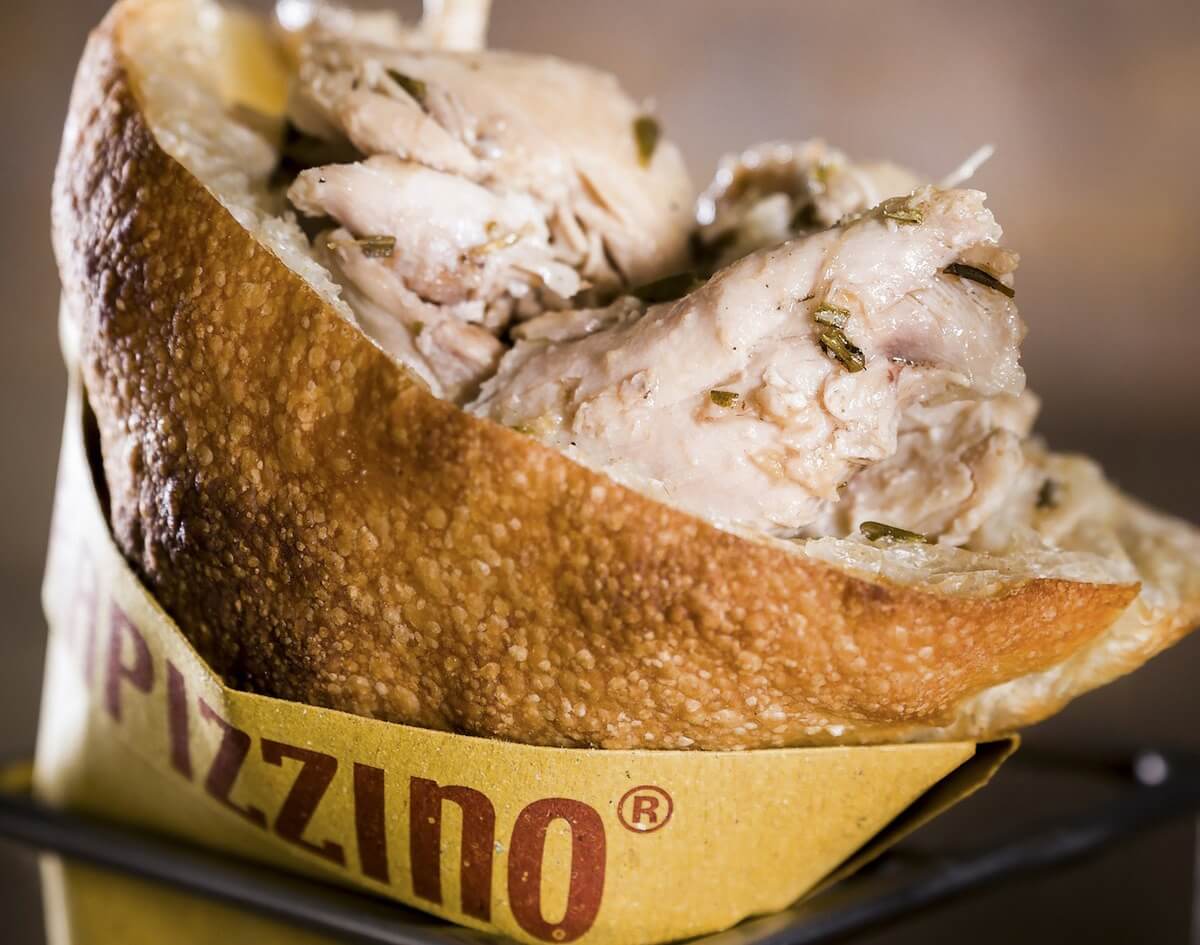 In foto: Trapizzino®, la “creatura” di Stefano Callegari, con “pollo alla cacciatora”. “Il pollo alla cacciatora è il primo gusto ad essere nato nella famiglia di Trapizzino e anche il più apprezzato in tutte le città, da Roma a New York” si legge nel sito trapizzino.it. “Non è una caso: è un grande classico della cucina italiana, che porta con sé un immaginario fatto di pranzi domenicali, sapori e profumi familiari che portano sorrisi e convivialità. Se a questo aggiungiamo che il pollo del Trapizzino è tagliato in pezzi e il sughetto di vino bianco, aceto e rosmarino si raccoglie nell’angolo di pizza… il gioco è fatto” (photo © trapizzino.it).