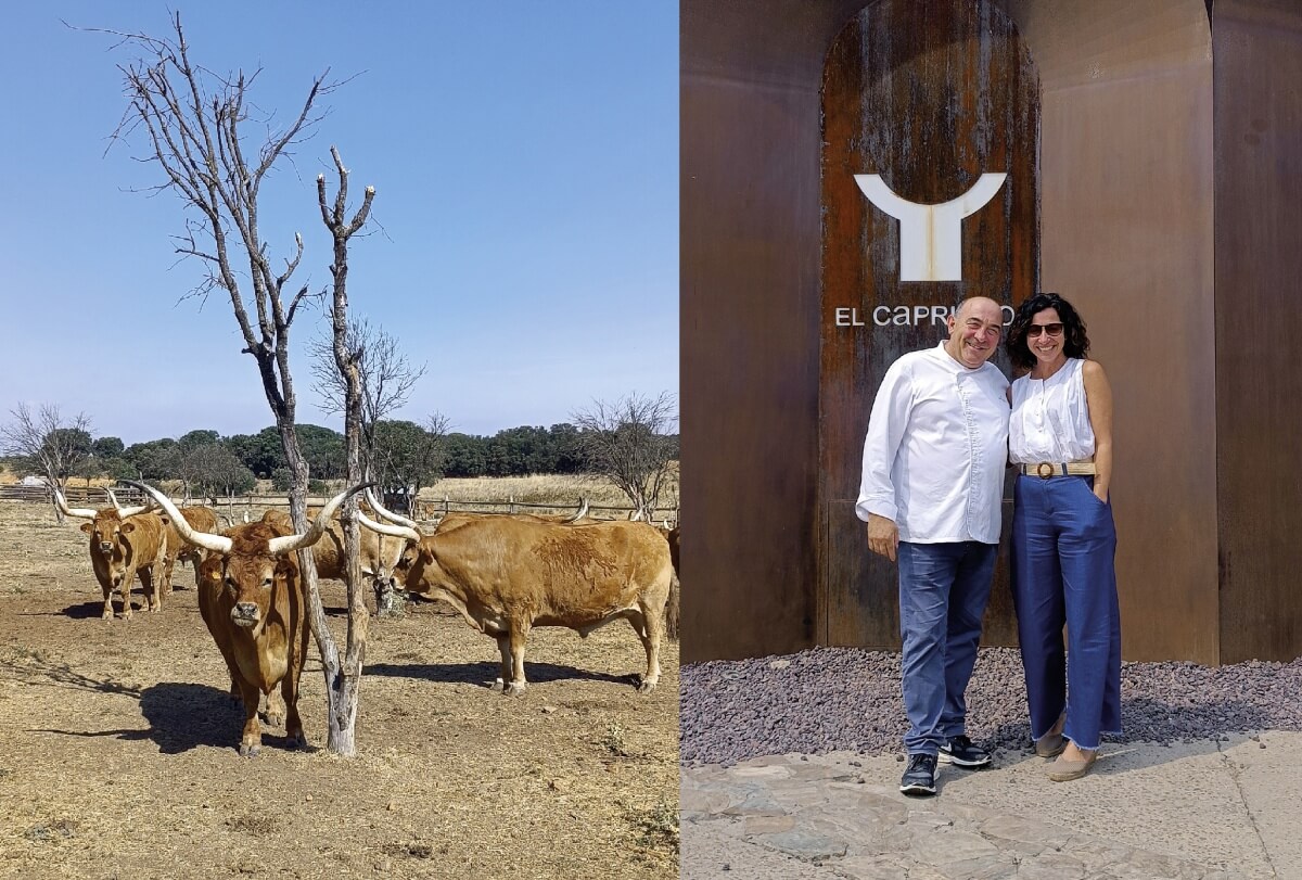 In foto: a sinistra, i buoi selezionati da José Gordón tra le regioni della Spagna e del Portogallo e allevati rispettando i ritmi naturali. A destra: Josè Gordón e Gaia Borghi all’ingresso del ristorante.