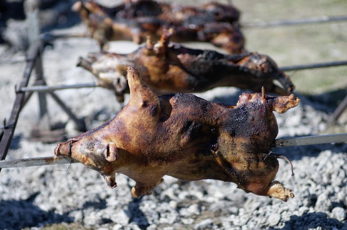 Sono tanti i testi riguardanti la gastronomia sarda editi in tale lasso di tempo, a cui si potrebbe affiancare la disamina storica fino a 25 anni or sono dei menù in uso nei più celebrati ristoranti dell’isola dove fra gli arrosti spicca sempre il porcetto sardo da latte. Ma la tradizione di su porceddu è sicuramente molto, molto più remota, in quanto elemento distintivo di quella cultura pastorale che domina nell’isola da tempo immemorabile e che, anche da questo punto di vista, avvicina la Sardegna ad alcuni popoli e Paesi dell’area balcanica e del Medio oriente. Lo dimostra anche a carraxiu, la “cottura sottoterra”, che personalmente ho visto fare pure in Giordania. Questa cottura è oggi meno diffusa perché non da tutti è facilmente praticabile, tuttavia rimane apprezzatissima, oltre ad essere molto suggestiva in tutte le sue fasi di preparazione. Rinviamo per questo motivo anche alla visione di un breve filmato pubblicato su YouTube1, dove sono fornite tutte le spiegazioni secondo le quali per cuocere il maialetto sotto terra bisogna scavare una buca di almeno 70 cm e predisporre 2 fuochi, uno dentro la buca e uno fuori che servirà per coprirlo. La legna deve essere forte (va bene anche quella tipo bancale). Su porceddu viene massaggiato e riempito con il trito di erbe aromatiche, tra cui parecchie foglie di mirto, che è anch’esso tra gli elementi più tipici del territorio sardo. Sale abbondante e ricopertura dell’intero animale con mirto. Per motivi di igiene nel video di presentazione viene calato nella buca avvolto nella stagnola, mentre un tempo lo si metteva dentro direttamente: “Adagiatelo con amore. Copritelo con la brace fatta nel fuoco esterno alla buca, coprite di terra delicatamente e poi accendete un altro fuoco sopra la terra”. La cottura, com’è evidente, richiede tempi lunghi: ben 6 ore per un maialino da 11 kg. L’estrazione può essere facilitata con l’aiuto di qualche giro di fil di ferro e la predisposizione di una specie di maniglie. L’importante è che venga estratto tutto intero. Il porcheddu ammurtau viene infine ancora ricoperto in foglie di mirto durante il periodo di raffreddamento. Nell’attesa, e durante la successiva conviviale degustazione, vino Cannonau a volontà.