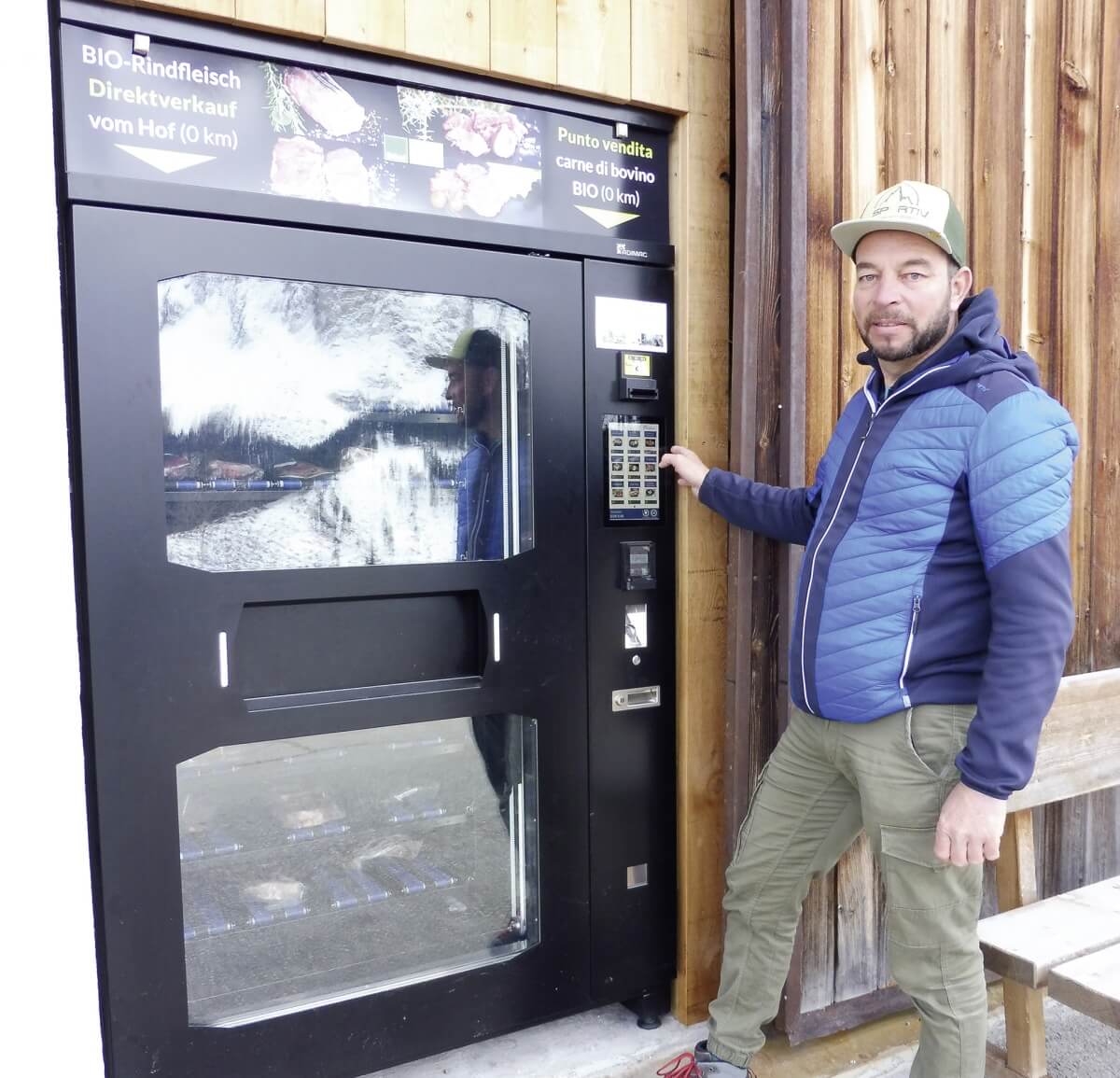 Tutti almeno una volta nella vita si sono avvicinati ad una macchina automatica dispensatrice di bevande o panini. Semplici e affidabili: scegli il prodotto, inserisci il denaro (oggi spesso sostituito dal gesto di avvicinare la carta di credito ad un occhio elettronico) e un preciso meccanismo fa cadere nell’apposito spazio la merce che è resa facilmente disponibile. Ma a pochi sarà capitato di acquistare con le stesse modalità una bistecca o un pezzo di carne per il bollito. Bisogna salire a Carezza, nel comune sudtirolese di Nova Levante, per incontrare una di questi ancora rari dispositivi in Italia. «È stato installato a dicembre del 2024 e per il momento dà buoni risultati» racconta Jürgen Pardeller nel maso poco lontano dal celebre laghetto difeso dalla Sirenetta. Un allevamento in regime biologico che conta oggi 20 fattrici mentre fino agli anni ‘80 il maso, che risale al 1582, contava su 70 vacche da latte.