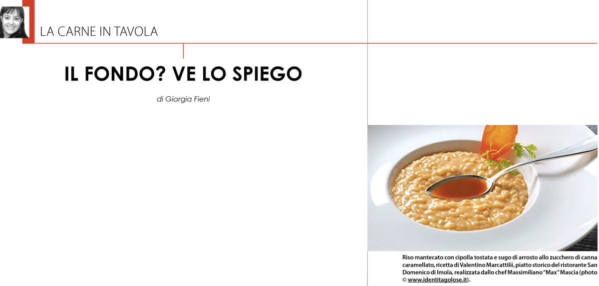 Il fondo o ristretto entra anche nei titoli delle ricette. Marco Ambrosino serve “Hummus di fave secche, ritagli di pesce, verdure fresche e fermentate, fondo bruno vegetale, sommacco”, dove i ritagli sono code, teste e pance e le verdure carote, cetrioli, cavolfiore, rape di Chioggia. Massimiliano Mascia il “Riso mantecato con cipolla tostata, ristretto di sugo d’arrosto caramellato allo zucchero di canna”. Davide Scabin il “Risotto cetriolo, ostrica e ristretto di Guinness”.