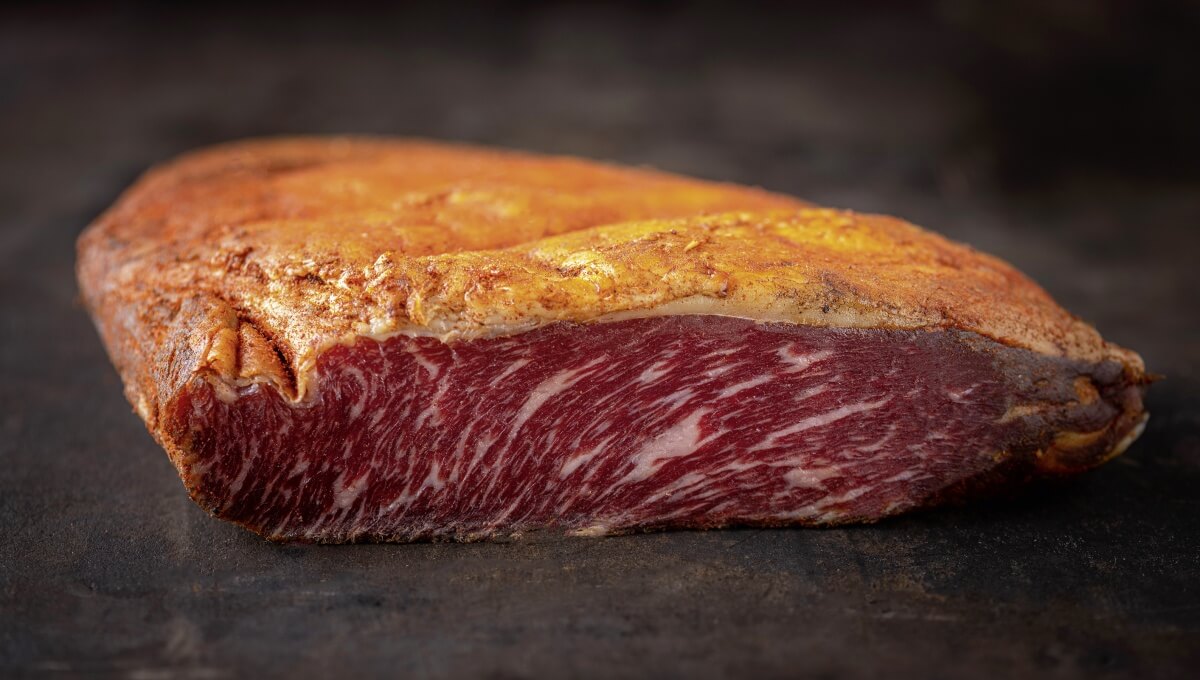 La base di Enigma è la picanha, la coda di manzo. La carne viene prima immersa in una salamoia delicata che le conferisce tenerezza e corpo. Segue uno strato di pimentón, una paprica spagnola delicata ricavata da peperoni essiccati al sole per due settimane. Una breve affumicatura con legno di faggio completa il piatto, conferendo alla carne un tocco caldo ed elegante. Enigma ha una consistenza morbida e un delicato gioco di sapori tra il salato, il dolce e l’affumicato. Ideale su un tagliere di salumi o come antipasto. Alla fiera Tavola di Kortrijk, in Belgio, Enigma ha ricevuto il Golden Tavola Awards, un importante riconoscimento per il Butcher’s Craft di De Laet & Van Haver ad Aartselaar.