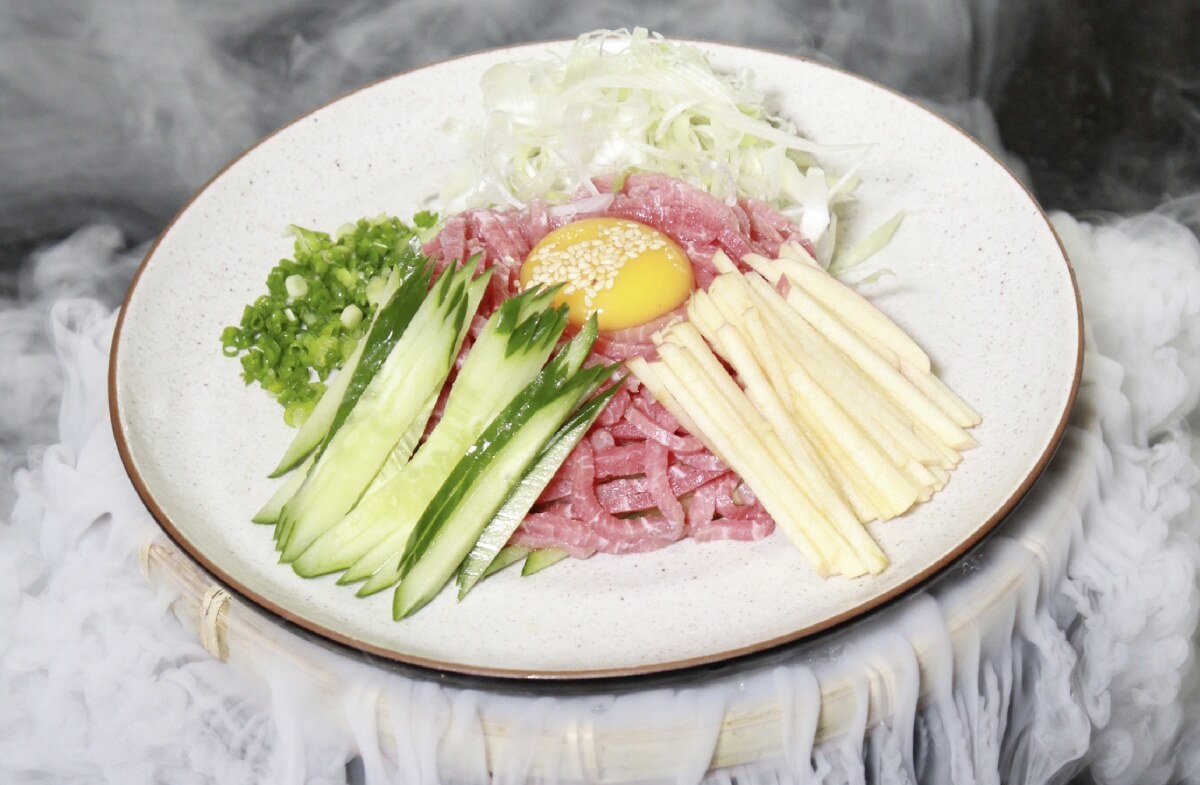 In foto: Yukhoe, la tartare alla coreana: si tratta di carne di manzo, talvolta di cavallo, o più raramente frattaglie, condita con salsa di soia, miele, olio di sesamo tostato, cipollotto, aglio, pinoli e gochugaru (pasta di peperoncino coreana). Viene servita solitamente con cavolo cappuccio e pera nashi a fiammifero. Il nome deriva dal coreano: “yuk”, carne, e “hoe”, crudo.