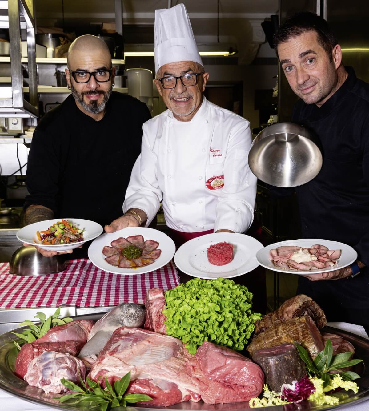Siamo andati in una trattoria di Carrù, un “tempio” del Fassona e una delle cinque tavole bandite e “assaltate” già prima dell’alba durante la nota “Fiera del Bue Grasso”. È il “Vascello d’Oro”, che ha preparato per Eurocarni alcuni piatti facendoci comprendere che in cucina la Piemontese si comporta come un “pesce”: cuoce velocemente e basta un attimo di troppo per perdere in succosità. Essendo una carne molto magra, non rilascia infatti il grasso che altre carni sciolgono in cottura, dunque ha bisogno di un sostegno: una noce di burro, un filo d’olio evo, un pizzico di sale… Tutto qui. Per il resto parla la carne con la sua qualità e delicatezza. Anche la frollatura è diversa: deve essere breve, perché la struttura della Piemontese non richiede tempi lunghi per intenerirsi. La finezza della fibra permette di ottenere piatti puliti, immediati, equilibrati. È quanto abbiamo imparato in questa trattoria che in fatto di carne e cucina fa scuola: un locale che sembra sospeso nel tempo. Le sue quattro salette sono arredate con mobili antichi, le credenze, la boiserie, i tavoli in legno e tutto il resto ci raccontano una storia centenaria: aprì i battenti nel 1887. Dal 1982, però, il “Vascello d’Oro” è gestita dalla famiglia Cravero, con il vulcanico Giuseppe — detto Beppe — in cucina, affiancato dal figlio Marco e dal collaboratore Christian Munoz. Una brigata che rende omaggio ogni giorno alla tradizione.