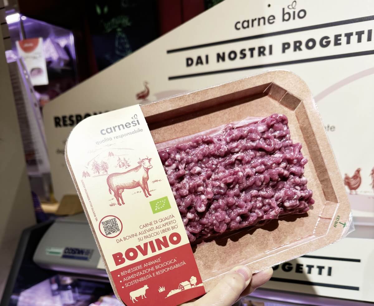 Ecco un pack tutto focalizzato su sostenibilità animale e ambientale e sul benessere animale, oltre che sull’allevamento bio. Questo trito di bovino adulto del brand CarneSì (Bioalleva Srl) mette ben in evidenza il prodotto e le modalità di allevamento (“bovini allevati all‘aperto su pascoli liberi bio”). La foto è stata scattata a fine dicembre 2025 presso un punto vendita NaturaSì (www.naturasi.it).