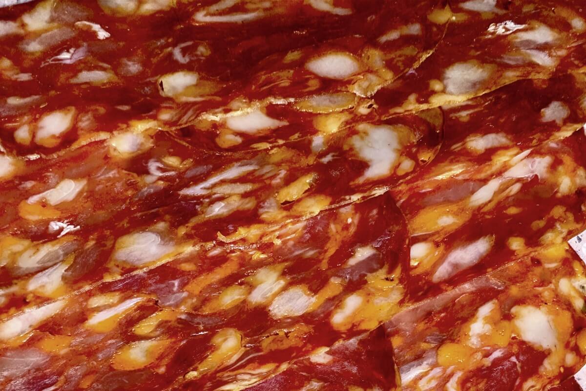 La texture di un salume è un indicatore della sua qualità e del processo di lavorazione a cui è stato sottoposto. Possiamo capirne gli ingredienti, soppesare la consistenza con lo sguardo e immaginare quale sarà il suo sapore all’assaggio. Iniziamo questa nuova rubrica con la spianata calabra, salume tipico della regione Calabria. La sua forma schiacciata, a cui deve il nome, in passato era ottenuta pressando la carne tra due assi di legno. Si prepara con carne di maiale magra tritata finemente e dadini di lardo, sale, peperoncino e altre spezie. Insaccata nel budello e poi pressata, è avviato alla stagionatura di almeno 4 mesi. Il colore è di un bel rosso accesso e il suo sapore è fortemente caratterizzato dalla piccantezza del peperoncino, elemento caratteristico della norcineria calabrese, che può essere usato anche nella versione più dolce. Si gusta da sola, una fetta alla volta, con pane casereccio e provola o sulla pizza.