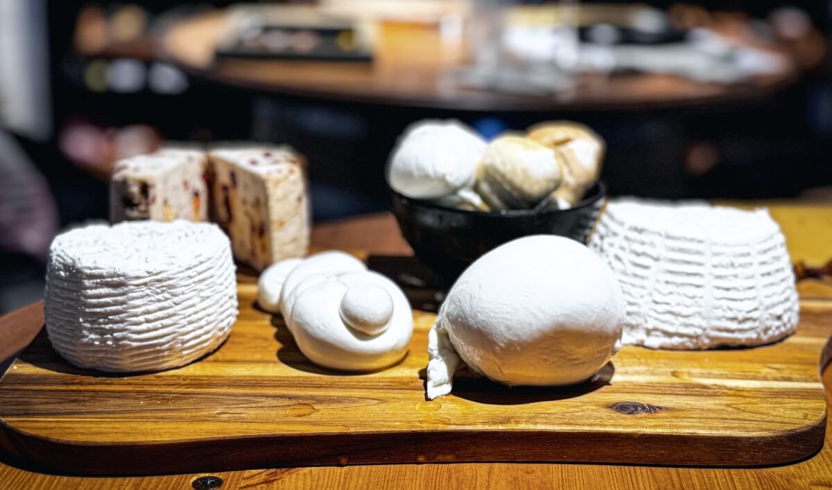 In foto: I formaggi di Tenuta del Lago in degustazione nei nuovi spazi aziendali riservati all’assaggio e alla vendita con “vista” sulla zona di produzione.