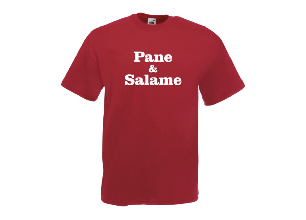 Lo merenda perfetta per una t-shirt colorata e bella da indossare anche in bottega, sotto al grembiule da lavoro. Pane e salame, l’essenza della semplicità e del gusto, al di delle mode, senza tempo. Si può acquistare al prezzo di € 19,90.