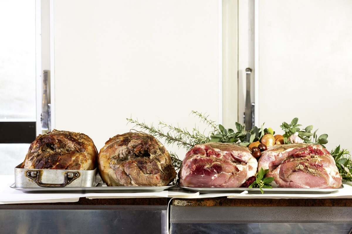 La cotenna protegge il cuore della coscia, conservando umidità e fragranza. Quando arriva il momento di sezionarlo, l’attenzione è massima perché da quel punto in poi il tempo corre veloce. Il prosciutto arrosto di Canale ha infatti vita brevissima, appena 36 ore. Niente conservanti, niente coloranti, solo la carne della coscia suina, il vino, le erbe e il calore del forno.