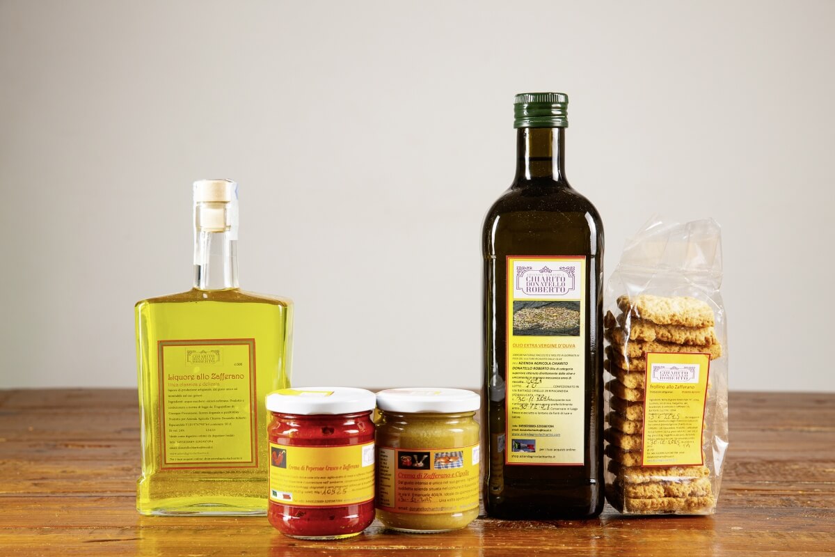 Le altre produzioni sono particolari e di nicchia: i Chiarito coltivano infatti zafferano (circa 1,2 kg l’anno). I fiori sono raccolti a mano ad ottobre, i bulbi venduti autonomamente e tutto il processo — dalla pianta all’oro rosso — avviene senza macchinari, per garantire genuinità e qualità. L’azienda valorizza poi erbe aromatiche come melissa, camomilla, timo e basilico per una produzione di spezie lavorata in modo completamente manuale al fine di preservarne le proprietà organolettiche. C’è anche una linea ampia di prodotti dolci e salati: taralli, pasta secca (formati come lagane, orecchiette, fusilli, strascinati) e biscotti (da latte e di pasta frolla), tutti aromatizzati allo zafferano, in percentuale controllata per valorizzarne il carattere senza sovrastarlo. Ma la fantasia non si ferma qui: abbiamo panettoni e colombe artigianali allo zafferano, cioccolatini al cioccolato fondente e mousse, miele e confetture (di pera o albicocca) sempre arricchiti con la spezia preziosa. Infine, c’è una linea originale con salumi, formaggi, sottoli, vellutate di funghi o zucchine, tutti aromatizzati allo zafferano, e persino liquori e birre zafferano-infusi: i liquori nascono in collaborazione con una distilleria del Pollino, mentre le birre sono frutto della passione.