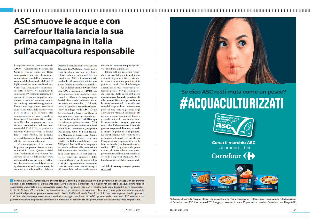 La collaborazione di Carrefour con ASC è iniziata nel 2018 con l’introduzione di un prodotto (cozze cilene), a cui hanno fatto seguito prodotti di altre specie (salmone, orata, branzino, mazzancolle…). Ad oggi, sono 25 i prodotti a marchio Carrefour con il logo verde ASC. «Come Società Benefit, Carrefour Italia si impegna a fare la propria parte per contribuire all’obiettivo del Gruppo Carrefour: raggiungere entro il 2025 il 50% di pesce proveniente da fonti sostenibili», commenta Josephine Ducatteau, CSR & Food transition Manager di Carrefour. «Siamo quindi orgogliosi di essere il primo retailer in Italia a collaborare con ASC per il lancio di una campagna nazionale dedicata alla promozione dell’acquacoltura certificata ASC: un modello rispettoso dell’ambiente, del benessere animale e delle comunità locali. Questa partnership strategica rappresenta un passo concreto verso un assortimento sempre più sostenibile, in linea con la nostra missione di creare un impatto positivo sul sistema alimentare».
