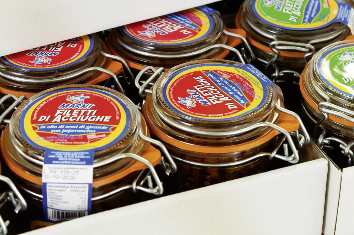 La Carlino ha un fatturato di 3,5 milioni di euro annui, per il 50% in arrivo dall’export, e 15 dipendenti fissi. Il mercato italiano è coperto per 1/3 dalla Gdo per il retail, per 1/3 dal canale Ho.re.ca. e per 1/3 dall’industria, a cui la Carlino vende preparati, cioè materie prime per fare salse di acciughe e di sarde (un prodotto trasformato e finito che vende in contenitori industriali). Il prodotto a marchio Carlino per retail e Ho.re.ca. è composto invece da confezioni di acciughe e sarde sotto sale, filetti di acciughe in olio (sia di oliva che di girasole), filetti di acciughe marinate, pasta di acciughe in tubetti, colatura di acciughe. La quota principale di prodotto è rappresentata dai filetti di acciughe. Certificata ISO 9001 già negli anni ‘90, e successivamente ISO 14001, BRC e IFS, Carlino ha saputo coniugare metodi di produzione industriali con rigore artigianale, garantendo tracciabilità, sicurezza e omogeneità di qualità. La sua capacità di innovazione si riflette anche nel packaging brevettato “La Barchetta”, un formato d’impatto per esposizioni e scaffalature di alto profilo. Al centro della strategia operativa c’è una scelta precisa: concentrarsi su pochi prodotti, svilupparli in profondità e raccontarli attraverso marchi coerenti. Il premium “Fior d’Acciuga” è pensato per scaffali gourmet, Mizar risponde a mercati più sensibili al prezzo. La produzione annua oscilla tra le 300 e le 500 tonnellate di trasformato, in maggioranza acciughe, prodotto più richiesto dal mercato e anche più remunerativo.