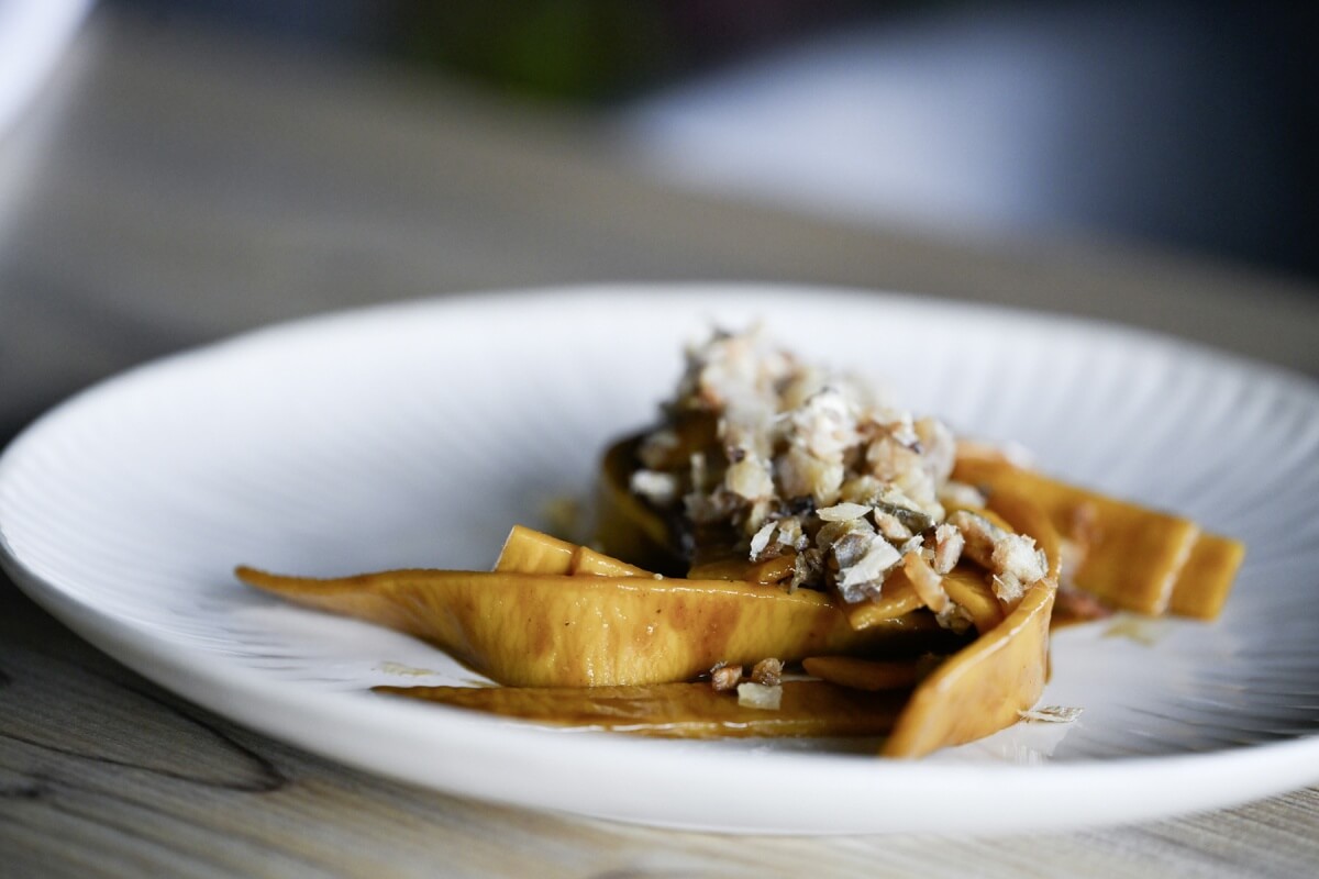 “Cibo di Mezzo” si pone come tramite e come facilitatore tra lo stimolare queste interazioni virtuose, osando, andando oltre. Ed è così che un piccolo pescatore, una minuscola produzione artigianale, arriva alla ristorazione e, dopo essere stata interpretata, viene raccontata con sempre un nuovo volto al commensale. «Dagli scarti di pesce, come le interiora, provenienti dalla cucina del nostro altro piccolo locale in centro a Crema — racconta Alessandro Sciortino — prepariamo un garum in versione accelerata, nel senso che fermenta più velocemente e in 10 giorni è pronto». Questo serve a regalare il piacevole sapore umami che caratterizza il piatto di pappardelle, insieme ad una spiccata (e direi piacevole) acidità.